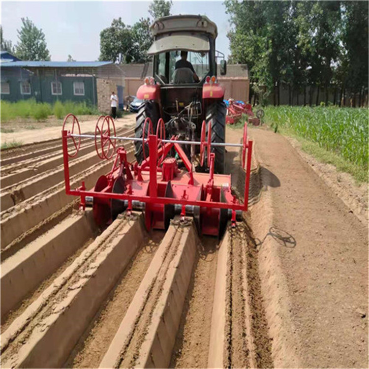 大蔥開溝機一般行距為80-85cm,溝底寬25cm,有7-10公分的軟土方便移栽,溝深30cm,一般使用40馬力以上拖拉機帶,一臺雙溝開溝機,一天可以工作50畝左右。